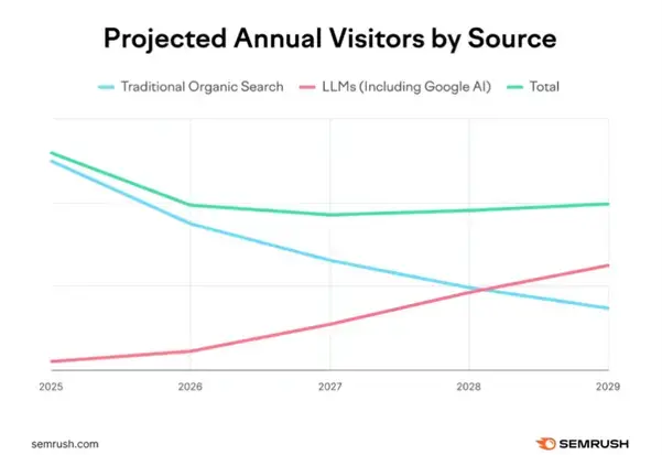 Si prevede che la quota di ricerche effettuate tramite strumenti di intelligenza artificiale aumenterà progressivamente, man mano che queste tecnologie diventeranno più familiari e accessibili, riducendo la dipendenza dagli strumenti di ricerca tradizionali.