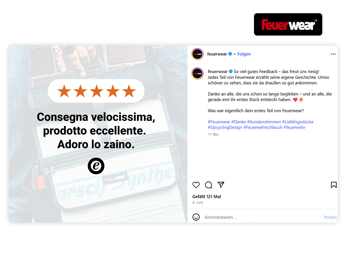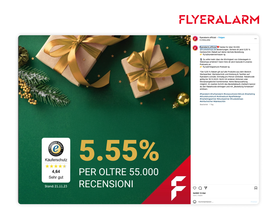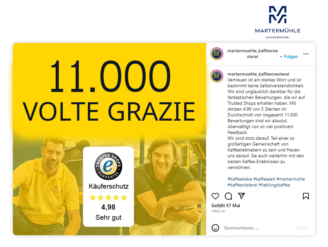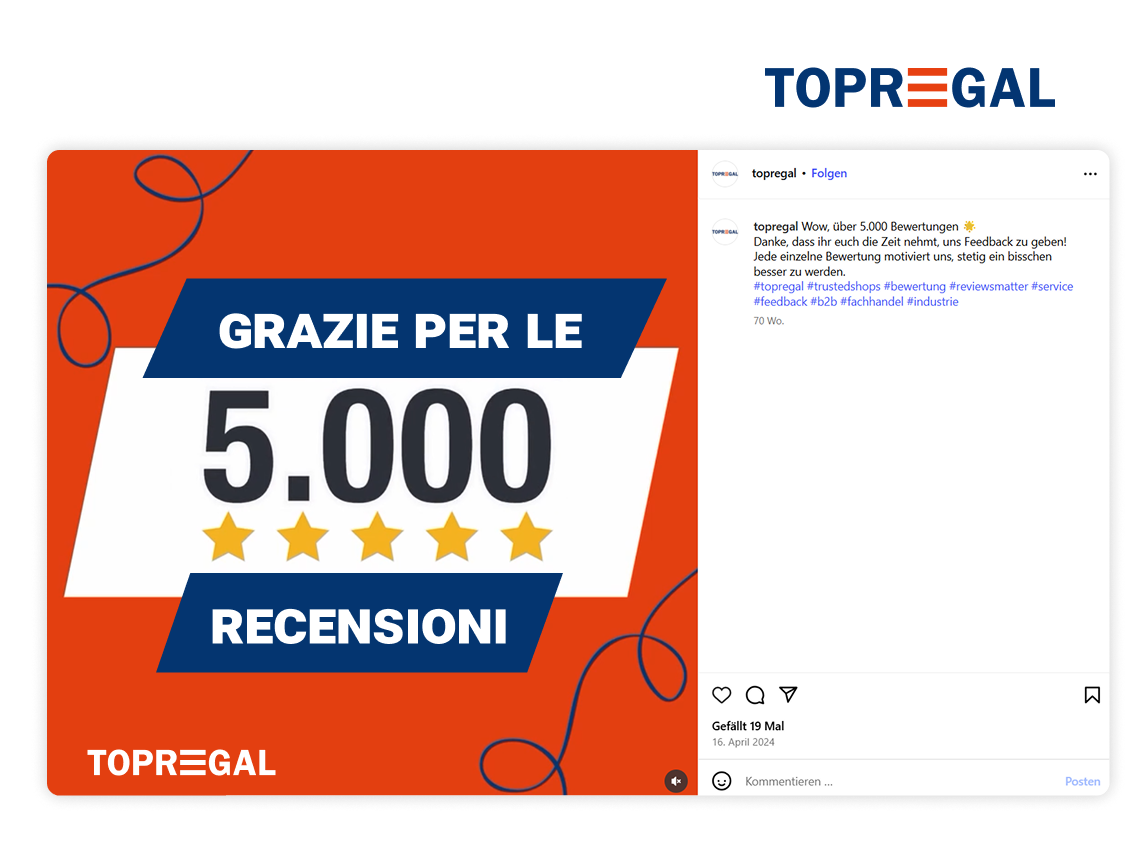 Che siano 100, 1.000 o 10.000 recensioni, condividi i tuoi traguardi con post o reel sui social e coinvolgi attivamente la tua community, ad esempio con un post di ringraziamento o una piccola promozione.